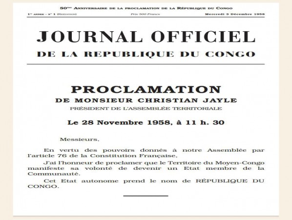 Le 28 novembre 1958 constitue une date fondatrice dans l’histoire politique du Congo. Ce jour-là, par la proclamation officielle faite par Christian Jayle président de l’Assemblée territoriale, le territoire du Moyen-Congo affirme solennellement sa volonté de devenir un État autonome au sein de la Communauté française et adopte officiellement le nom de République du Congo.